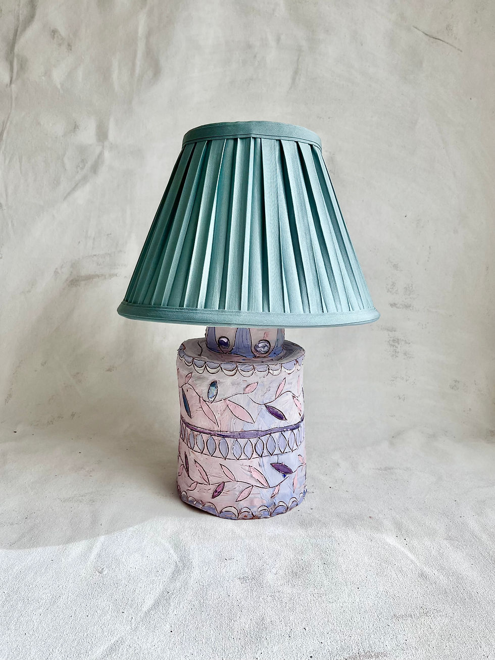 The base is made from terracotta clay, hand formed, carved and decorated before being kiln fired in London to 1080°C. It features subtlepurple lustre details that catch the light, along with hand carved botanical motifs created using a sgraffito technique.